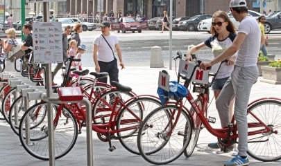 На Тверском бульваре машин стало меньше. А вот велосипедистов - больше. Москвичи и гости столицы берут двухколесные машины в открывшихся пунктах проката. Похоже, к этой новации люди отнеслись гораздо с большим теплом, хотя эта услуга тоже платная.