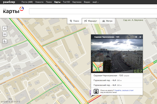 При клике на кнопку "Камеры" на "Рамблер-Картах" появляются специальные иконки – они обозначают места, где установлены камеры. Вы можете сопоставить изображения c веб-камер с данными о пробках, посмотреть картинки с соседних камер и принять решение об оптимальном маршруте.