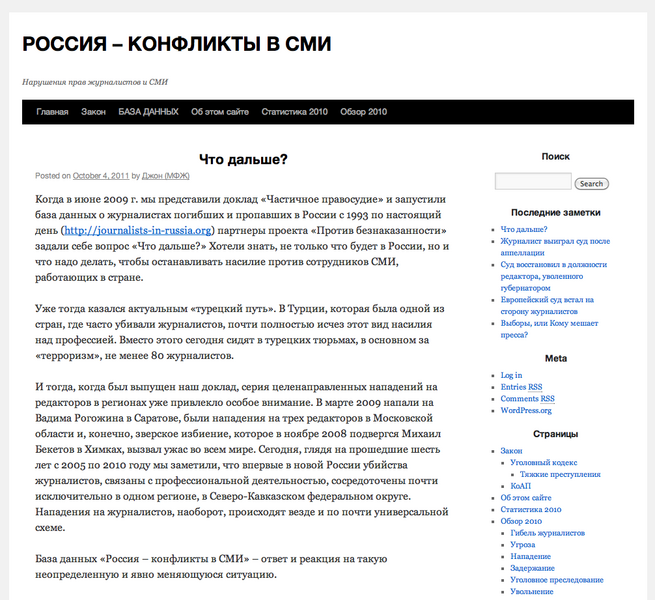По данным разработчиков сайта, сегодня в базе "Россия - конфликты в СМИ" зафиксировано более 300 записей о правонарушениях в отношении работников СМИ, а также есть данные о погибших, пропавших без вести и погибших насильственной смертью журналистов. Самое большое число записей относится к пункту "угроза".
