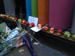 Поклонники Джобса и продукции его компании Apple скорбят в Калифорнии, Нью-Йорке, Чикаго, Бостоне, Монреале, Париже, Токио, Пекине. И это далеко не полный список. Пожалуй, наиболее символичным знаком печали стало изображение колеблющегося пламени свечи на экранах персональных iPhone, iPad и Mac. А самым распространенным символом стало яблоко - логотип Apple. Яблоки вместе с цветами и памятными фотографиями лежащие у дверей магазинов компании Apple, испещрены надписями "Прощай", "Нам будет тебя не хватать", "Спасибо, Стив", "Ты сделал мир лучше". Они выведены фломастерами, искусно вырезаны на кожуре яблок, написаны на бумажных листках, воткнутых у основания яблочного черенка. В сети Twitter чаще всего в эти дни встречается текстовое послание iSad /Я скорблю/.
