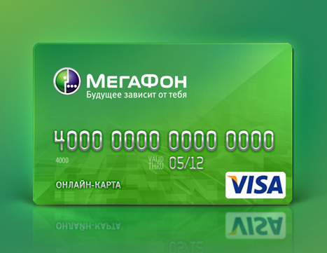 Онлайн–карта МегаФон -Visa позволяет абоненту "МегаФона" совершать покупки и оплачивать любые товары и услуги в Интернете: online-игры, авиа и ж/д билеты, музыку, фильмы, а также совершать покупки в iTunes, PayPal, AppStore на сумму до 15 000 рублей. Счет карты "привязан" к балансу мобильного телефона. Поэтому абоненты "МегаФона" могут пополнить счет своей новой карты так же, как счет своего мобильного телефона.