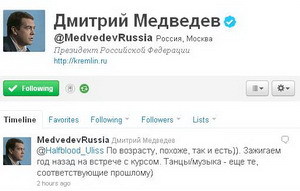 "Зажигаем год назад на встрече с курсом. Танцы/музыка - еще те, соответствующие прошлому", - написал Медведев в своем "Твиттере" в ответ на послание юной россиянки, которая, посмотрев размещенное во Всемирной сети видео, поделилась с президентом своими впечатлениями: "Вы танцуете как мой папа! Сегодня с утра отличное настроение благодаря видео с Вами".